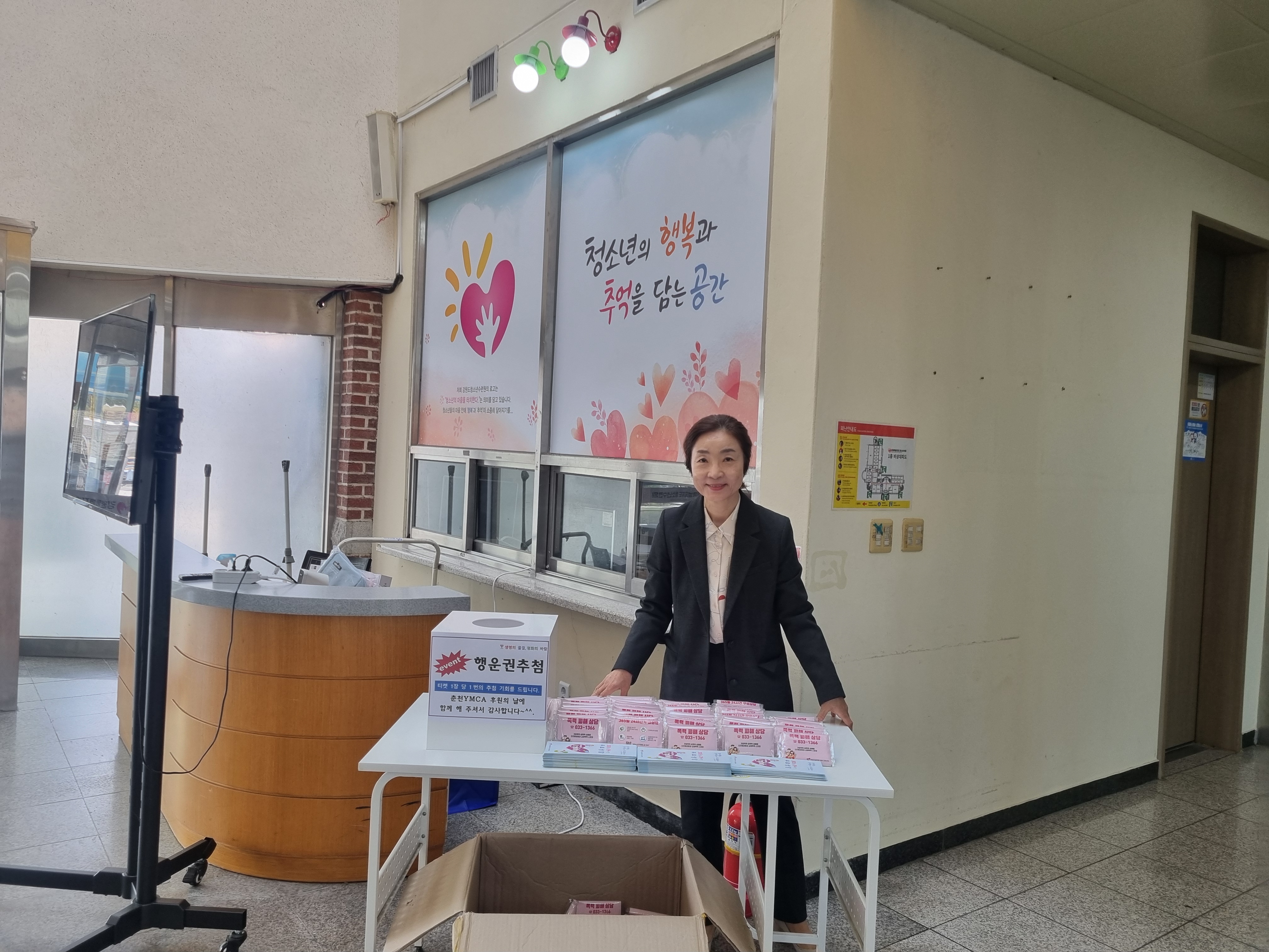 내용: 기관간 네트워크를 통해 폭력피해자의 원활한 지원을 위한 상호 협력체계 구축 및 아동청소년안전망강화를 위한 춘천 YMCA 후원의 날 참석 홍보를 통하여 기관이용자들에게 여성긴급전화1366 강원센터의 기능과 역할을 알리고 인지도를 높이고자 함