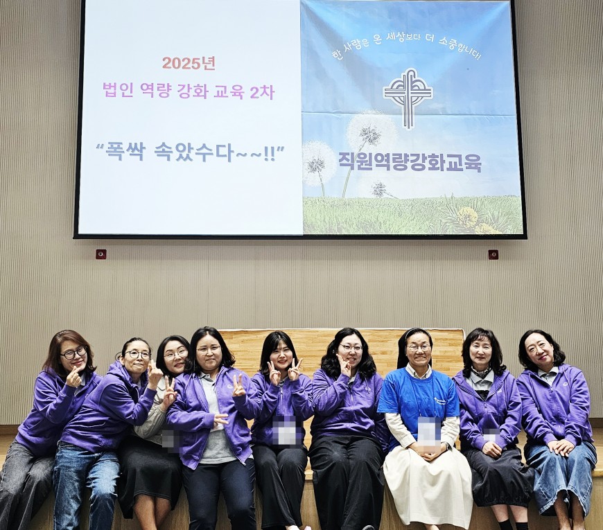 ▶내용: 센터의 전직원이 2025년도 착한목자 수녀회 법인교육을 받음으로써 착한목자 수녀회의 정신과 철학을 이해하여 법인의 사명과 비전을 실천 행동으로 함께 이루어가기 위한 지원 역량을 강화시키기 위해 교육에 참여함.